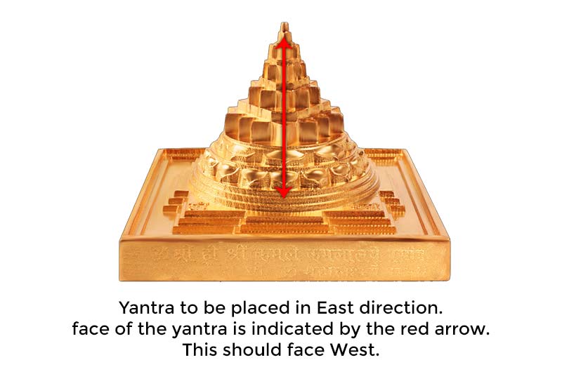 If you look at the tip of a Shree Yantra, you would find only one of them which is exactly in line with the bottom base (The other two are off-centred). This is the Face of the yantra and it should face the West. You may place the Shree Yantra in the East portion of your dwelling. It should be placed in such a location that it is visible from all sides as it will affect all locations from where it is visible. The back of the yantra (Exactly opposite the tip) does not show any energy, and it is best placed against a wall. The yantra is best placed at a height reaching up to your heart level.