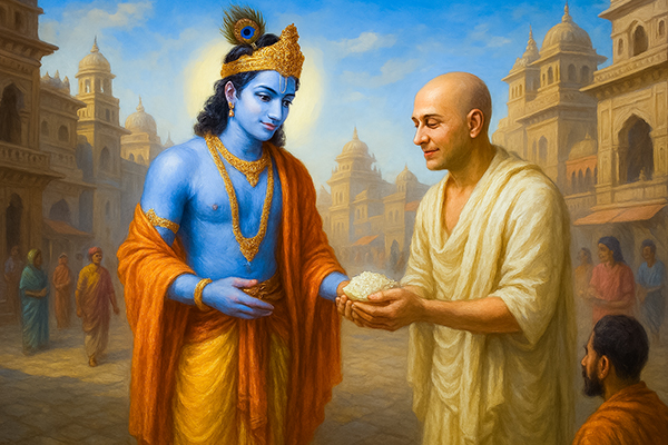 Krishna, seeing the bundle of beaten rice Sudama hesitantly carried, eagerly took it from him and ate a handful with great joy, considering it the most valuable offering. Before he could take a second handful, Goddess Rukmini (Krishna’s consort) stopped him, understanding that with just one handful, Krishna had already blessed Sudama with immense prosperity beyond imagination.