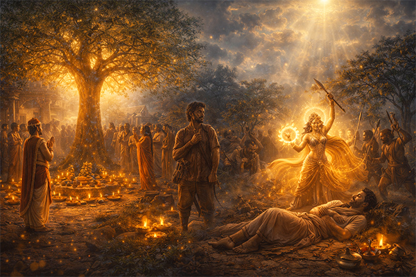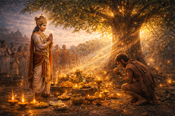 Unbeknownst to him, the day was Amalaki Ekadashi, and the sacred tree under which he lay was imbued with the divine essence of Bhagwan Vishnu. Protected by its spiritual energy, the merchant was shielded from further harm as wild animals and natural dangers mysteriously kept their distance. When he regained consciousness at dawn, Dhanapala felt an overwhelming sense of gratitude and peace that he had never experienced before.