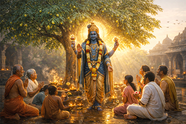 Years later, when the tribal man’s earthly life ended, he found himself welcomed into Vaikuntha, Vishnu’s celestial abode. The Bhagwan himself revealed that the simple yet heartfelt act of devotion on Amalaki Ekadashi had absolved him of all sins and granted him liberation. This tale immortalizes the truth that the sincerity of one’s heart far outweighs the grandeur of rituals in the eyes of the divine.