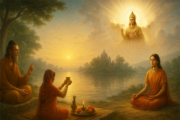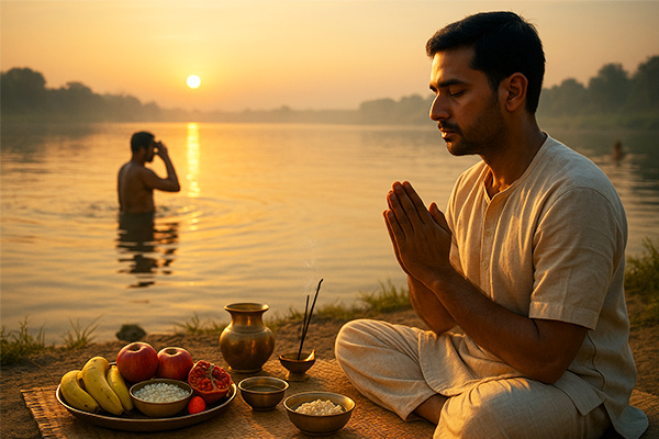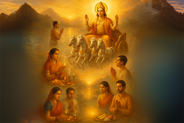 After bathing, devotees offer prayers to Lord Surya, typically facing the rising sun. They chant mantras such as the Gayatri mantra or Surya Ashtakshara mantra to invoke the blessings of the Sun God. Offering water to the Sun is an essential part of the prayer, as it is believed that this act helps in dispelling ailments, removing obstacles, and gaining vitality. During the worship, devotees may also offer flowers, incense, and fruits, with a focus on surrendering to the divine light of the Sun for blessings of health, prosperity, and longevity.