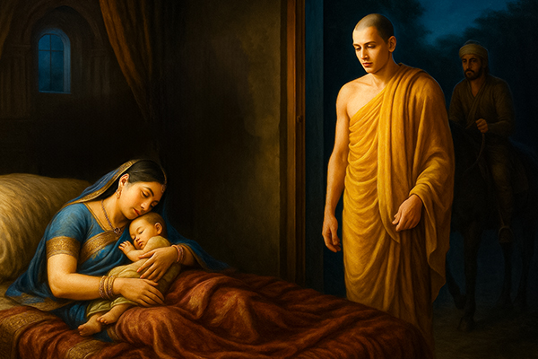 One fateful night, with unwavering determination, Siddhartha renounced his princely life. As the palace lay in slumber, he took a final glance at his sleeping wife Yasodhara and their infant son Rahul, knowing that he must walk the path of truth, not as a prince, but as a seeker. Quietly, he left behind his crown, wealth, and familial bonds, venturing into the solitude of the forests.