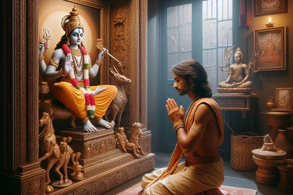 Once the ingredients were received, the man went by the riverside, had his bath, and prepared food. Then sitting on the riverbank, he invoked Bhagwan Vishnu to come and have the food first. Hearing his invocation, Bhagwan Vishnu appeared and had what was offered. The man too had food and carried on with the rest of the day.