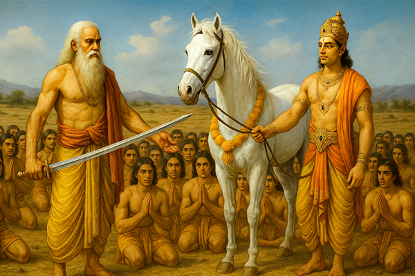 Once upon a time, in the celestial realms, the divine River Ganga flowed blissfully, adorning Lord Vishnu’s feet before settling in Lord Brahma’s heavenly abode. However, her descent to Earth was predestined by a great act of devotion. In the mortal world, there ruled a mighty king named Sagara, blessed with sixty thousand sons. To establish his supremacy, he performed the Ashwamedha Yajna (horse sacrifice ritual), but fate had other plans. As part of the ritual, a sacred horse was set free to roam, but Lord Indra, the king of the gods, grew envious and cunningly hid the horse in the hermitage of Sage Kapila, who was deep in meditation.