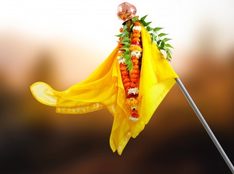 People raise Gudhi (Gudi) on the right side of their houses on the outside. It is made of a long wooden bamboo covered with an overturned copper pot called Kalasha and a brocade-filled yellow piece of cloth (green or saffron at times). Atop are the sugar crystals, neem leaves, and a twig of mango leaves with a garland of flowers is kept.