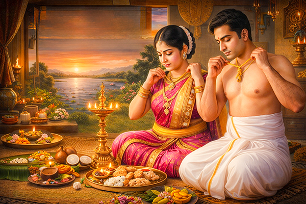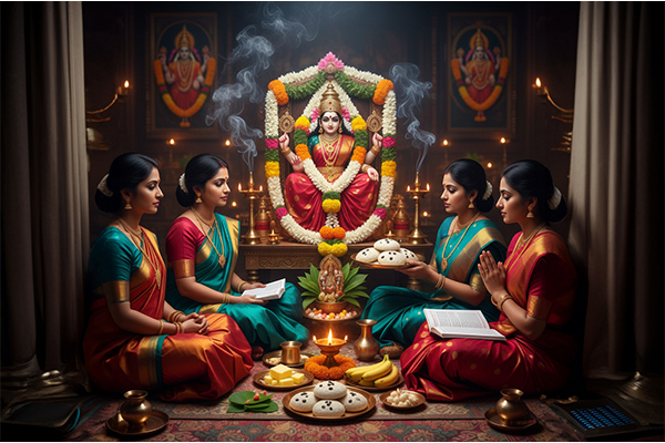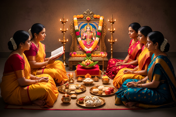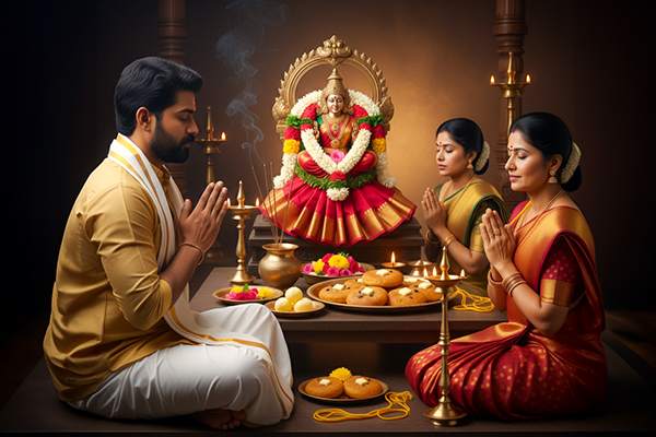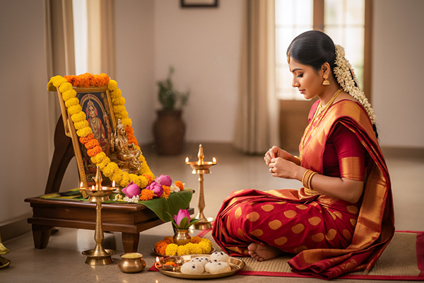 At the precise muhurat , the puja is performed to honor Goddess Kamakshi. Devotees prepare Karadai , a special offering made from rice flour, jaggery, and black-eyed peas, and present it to the Goddess along with butter as Nivedyam . The key ritual involves tying the Manjal Saradu (yellow sacred thread) around the neck while reciting prayers, symbolizing the devotee's faith, gratitude, and commitment to familial harmony and prosperity.