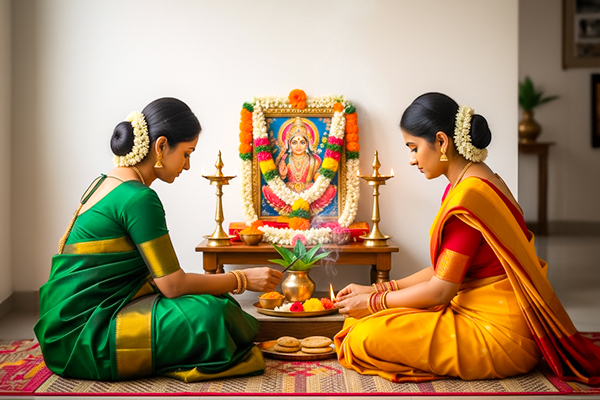 The Karadaiyan Nombu puja begins with thorough preparations to create a sanctified environment. Devotees clean their homes and the puja space to welcome divine energies. An altar is set up with an image or idol of Goddess Kamakshi or Parvati, decorated with fresh flowers, turmeric, and kumkum. Women observing the vrat take an early morning bath, wear clean traditional attire, and mentally prepare for the rituals with devotion.