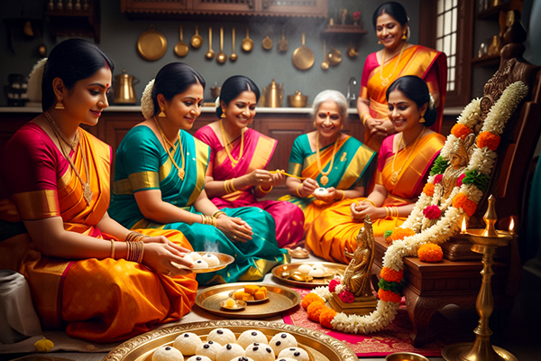 - Sacred Rituals: During the muhurat , women offer prayers to Goddess Kamakshi, invoking her blessings for the longevity, prosperity, and well-being of their husbands and families. They chant sacred hymns and mantras while performing the puja.