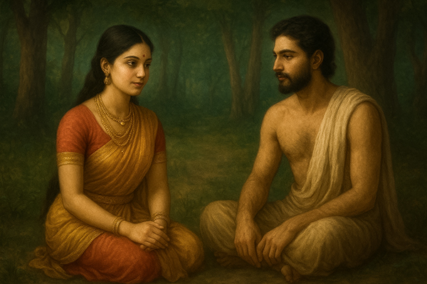 Savitri, the beautiful and wise daughter of King Ashwapati, chose Satyavan, a noble yet impoverished prince, as her husband. Despite learning from the sage Narada that Satyavan was destined to die exactly one year after their marriage, Savitri remained resolute in her decision, firmly believing in the power of her devotion and righteousness. With her father's reluctant blessing, she married Satyavan and began a simple yet fulfilling life in the forest, embracing her role as a devoted wife and daughter-in-law.