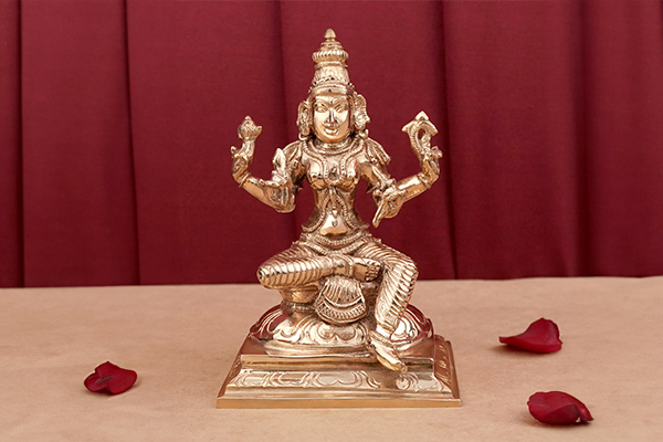 Made in shining bronze, this exquisitely crafted idol features Goddess Tripura Sundari seated in Lalitasana on traditionally crafted dais. The idol crafted by artisans of South India, looks magnificent with brilliant luster and intricate craftsmanship that brilliantly features the clothing, jewels and physical features.