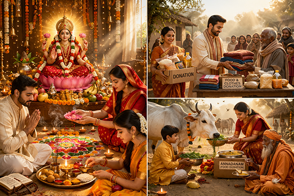 Acts of charity hold a significant place in Lakshmi Jayanti celebrations. Devotees are encouraged to donate generously to the needy, sharing their blessings as an expression of gratitude to Lakshmi Devi. Offering food, clothing, and monetary help to the less fortunate is believed to please her, as she embodies compassion and selflessness. Feeding cows and performing Annadanam (offering food) to Brahmins and the poor are considered particularly auspicious, reinforcing the virtue of generosity as an essential path to divine blessings.