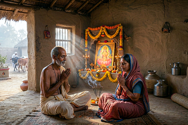 The Brahmin couple, eager to follow the sage's advice, prepared for the vrat on the auspicious day of Phalguna Purnima. They bathed early in the morning, cleaned their home, and set up a simple yet sacred altar with an image of Lakshmi Devi. With utmost devotion, they performed the puja, offered flowers, fruits, and sweets, and chanted the Lakshmi Ashtottara Shatanamavali. They observed a strict fast, abstaining from all grains and indulging only in meditation and prayers throughout the day.