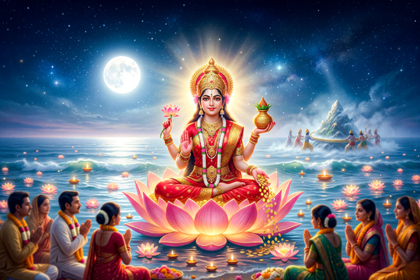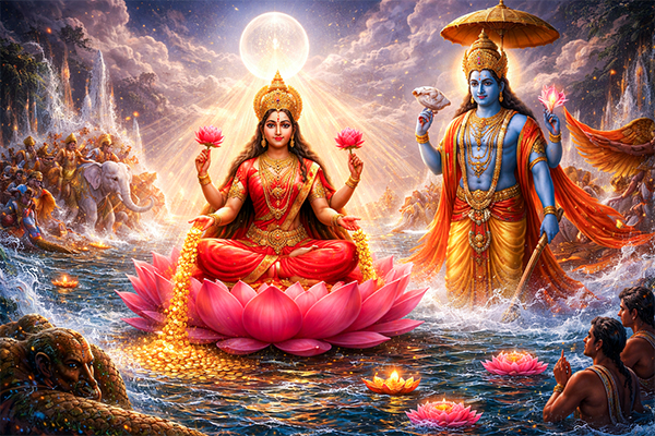 The most well-known story associated with Lakshmi Jayanti is her divine emergence during the Samudra Manthan , the great churning of the ocean of milk by the gods (Devas) and demons (Asuras). This epic event, described in the Puranas , was a collaborative effort to extract Amrita (the nectar of immortality) from the cosmic ocean. As the churning progressed, several divine gifts and beings arose from the depths of the ocean, including Goddess Lakshmi, who emerged radiant, seated on a lotus, and holding symbols of prosperity and fortune. Her arrival marked a turning point in the event, as her blessings brought balance and harmony. Lakshmi chose Bhagwan Vishnu, the preserver of the universe, as her consort, symbolizing the union of wealth and preservation, and her blessings ensured prosperity and order in the cosmos.