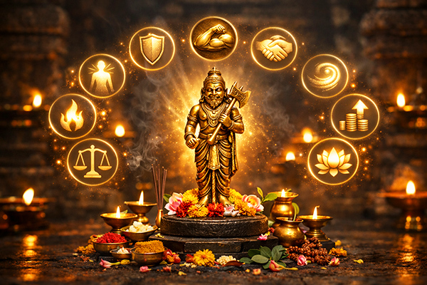 Worship of Bhagwan Parashurama brings a range of spiritual, mental, and material benefits. Spiritually, it fosters inner growth, clarity, and enlightenment by connecting devotees with divine energies and strengthening their commitment to righteousness. Mentally, it enhances courage, discipline, and the ability to overcome personal challenges, while also promoting peace, harmony, and the removal of negative influences. Materially, worship is associated with protection from adversaries, resolution of disputes, improved financial stability, and success in career and personal endeavors. The rituals also foster positive energy, strengthen family bonds, and support the fulfillment of desires and spiritual aspirations.