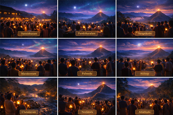 - The flame appears three times as Makara Vilakku, marking the divine moment