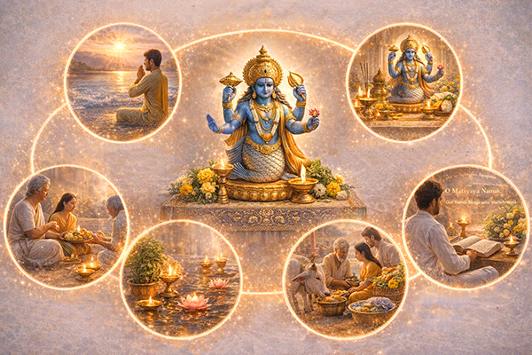 - A sankalp (vow) is taken before Bhagwan Vishnu or Matsya Avatar, praying for spiritual progress, removal of sins, and divine protection.