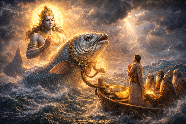 As Satyavrata stood in awe, trying to comprehend this miraculous event, Bhagwan Vishnu revealed His divine form as Matsya, His eyes filled with cosmic wisdom and boundless compassion. His resplendent form shone with the brilliance of a thousand suns, His voice echoing like thunder through the heavens. Bhagwan Matsya spoke, revealing to the king an impending pralaya (great deluge), which would soon engulf the entire earth in its powerful waves. He instructed Satyavrata to construct a massive boat and gather within it the seven great sages (Saptarishis), sacred seeds of all plants, and pairs of every living species so that life could be preserved beyond the destruction.
