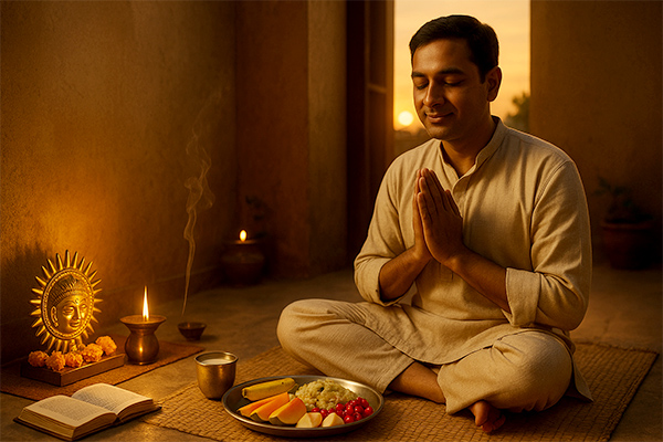 Pray to Bhagwan Surya (the Sun God) by offering water, flowers, and rice. Light lamps and chant simple mantras to seek blessings for prosperity and spiritual growth.