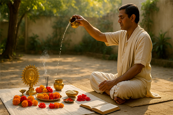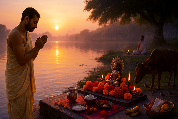 After the bath, devotees set up a clean altar or worship space, decorating it with flowers, lamps, and incense sticks. The Sun God ( Surya Dev ) is the primary deity of this puja, and offerings such as water, rice, jaggery, and red flowers are made to honor his presence. Chanting Surya mantras , such as 'Om Suryaya Namah,' while offering water to the Sun is considered highly auspicious and invokes his blessings for health, prosperity, and spiritual clarity.