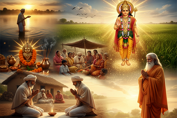 On the day of Meena Sankranti, the farmer woke early, bathed in the nearby river, and vowed to observe the vrat with complete devotion. He performed puja to Bhagwan Surya, offered water (arghya), flowers, and rice, and meditated with a pure heart. Despite his limited resources, he donated food to the needy and shared whatever he could with others. His sincere prayers and acts of charity pleased the Sun God, who appeared before him in a divine vision.