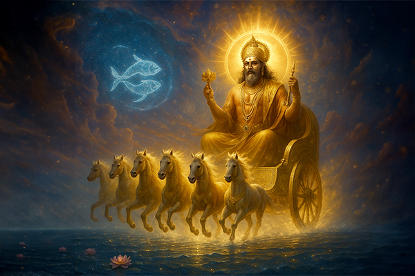 Ultimately, the story of Bhagwan Surya's transition into Pisces teaches that just as the Sun moves forward to embrace the new, humans too must seek balance between their material and spiritual pursuits. It reminds us that introspection and purification are necessary steps toward achieving enlightenment and aligning with the cosmic rhythms of life. This celestial journey of Bhagwan Surya thus becomes an inspiring allegory for personal growth, spiritual awakening, and the eternal cycle of transformation.