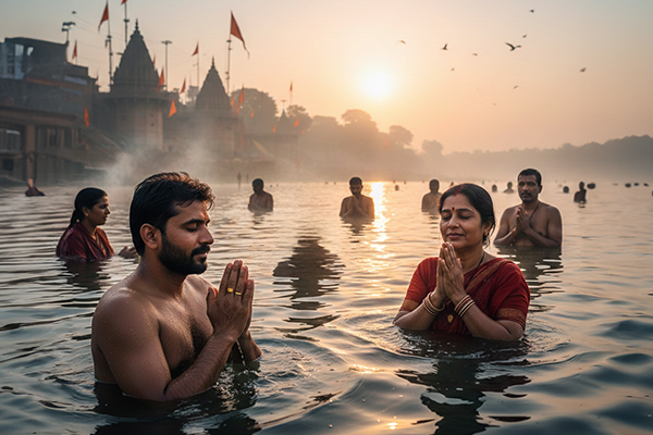 The first rays of the Sun on Mesha Sankranti are believed to carry immense spiritual energy. Taking a sacred bath in holy rivers like the Ganga, Yamuna, or Godavari purifies the body and soul, washing away past sins and ushering in positivity. If visiting a sacred river isn't possible, a bath at home with a few drops of Gangajal (holy water) is equally auspicious.
