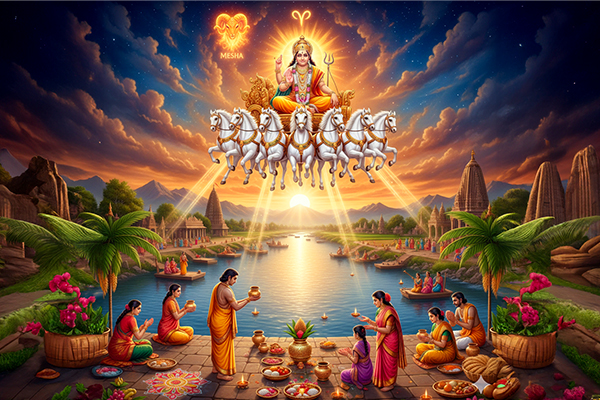 The exaltation of Surya Deva in Aries remains the most significant celebrated legend of Mesha Sankranti, serving as a timeless reminder of the Sun’s divine power, the renewal of energy, and the boundless potential of light over darkness.