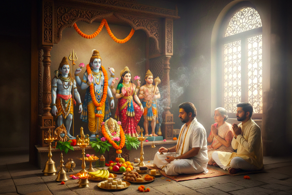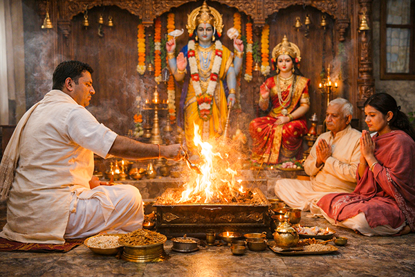 Lighting a holy fire (havan) and offering oblations of ghee, sesame, and barley into the sacred flames appeases the planetary forces and removes negative karma. Special Sankranti Puja is performed to welcome the divine transition of the Sun, bringing peace and prosperity to the household.