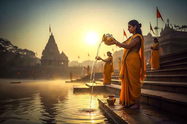 Since this festival is dedicated to Bhagwan Surya (the Sun God), offering Arghya (water) to the rising Sun while chanting the Gayatri Mantra or the Surya Ashtakam is believed to grant vitality, prosperity, and success. Devotees also light oil lamps and offer red flowers, jaggery, and wheat grains to Surya Bhagavan.