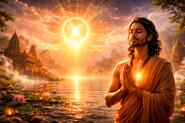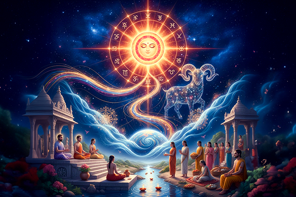 According to Vedic cosmology, the Sun undergoes a grand transition as it moves into Mesha Rashi (Aries), its sign of exaltation, marking the most auspicious time for cosmic alignment and spiritual purification. Scriptures state that when Surya Deva enters Aries, he attains his highest strength, radiating supreme energy, vitality, and divine brilliance, ensuring prosperity, renewal, and the awakening of higher consciousness in the universe. This celestial shift is believed to balance the forces of nature, rejuvenate the earth, and open a new phase of dharma and righteous action.