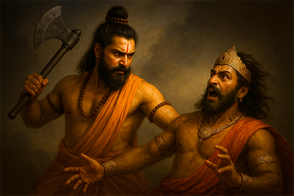 Parashurama’s life took a fateful turn when Kartavirya Arjuna, the powerful demon king, came to visit his father, Sage Jamadagni’s hermitage. After being treated with hospitality, the king, overcome by greed, stole Kamadhenu, the sacred cow that had the power to grant any wish. Kamadhenu was a gift from the gods to Jamadagni, and its theft was a grave injustice. Furious and heartbroken, Parashurama took up his divine axe and set out on a mission to confront Kartavirya Arjuna. In an epic battle that seemed impossible for a single warrior, Parashurama triumphed, slaying the demon king and restoring balance to the world. Yet, this victory would only mark the beginning of a long journey filled with sorrow and vengeance.