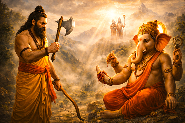 One of the most intriguing stories involves Parashurama’s interaction with Bhagwan Ganesha. As a devoted follower of Bhagwan Shiva, Parashurama once traveled to Mount Kailash to meet Shiva. However, he was stopped at the entrance by Bhagwan Ganesha, who had been instructed by Shiva and Parvati not to allow anyone inside during the narration of the Rama Katha. Parashurama, undeterred, accepted the challenge of combat, and in their ensuing battle, he severed Ganesha’s left tusk. This act earned Ganesha the name “Ekadanta,” meaning the one-tusked Bhagwan.