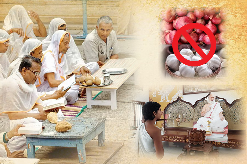 During Paryushan, simple dishes are prepared. Although it is commonly known that Jain cuisine is devoid of garlic, onion, and potatoes, Jains also avoid leafy green vegetables and fruits during this time. Milk and dairy products, rice, lentils, cereals, and pulses are the most consumed. In addition to the traditional dal chawal, rotis, gatte ki sabzi, dry methi sabzi, methi thepla, paanch kuta, boondi raita, gatte ka pulav, and coconut chutney are prepared. Laasi, rice kheer, and aate ka halwa are desserts that are prepared.