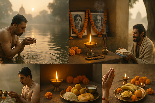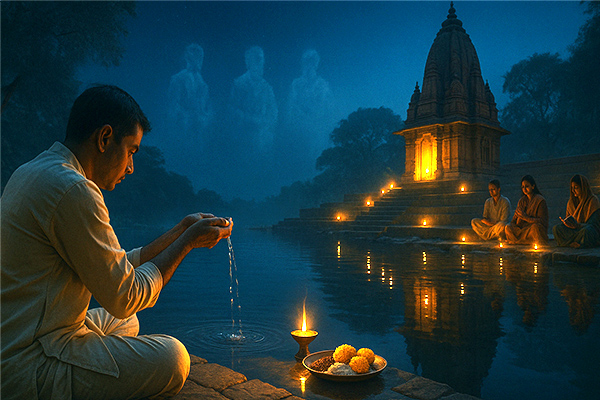 One of the central rituals of Phalguna Amavasya is Tarpan , where water mixed with sesame seeds, black til (sesame), and kusha grass is offered to the ancestors. This is done to seek peace and blessings for the departed souls. While offering Tarpan, devotees chant mantras or prayers, invoking their ancestors and requesting their blessings for prosperity, peace, and spiritual progress for the family.