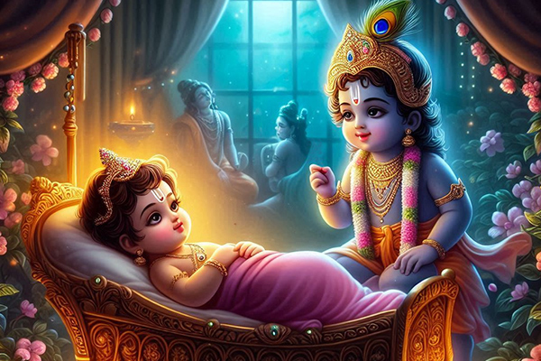 On a half-moon night in the month of Bhadra, King Vrishabhanu came to the Jamuna to bathe and found himself engulfed in a golden aura, the golden aura of pure love. It was emanating from a lotus, which had a baby girl standing on its whorl. When the king returned to the palace with the baby, Queen Kirtida was delighted. She was also shocked that the girl was blind. On the other side, Yashoda, the mother of Krishna, found that her best friend Kirtida had a baby. She quickly came to see the girl with the baby Krishna. When the baby Krishna crawled up to the cradle, pulled Himself up, and looked at the baby girl, miraculously, she opened Her eyes to everyone’s delight.