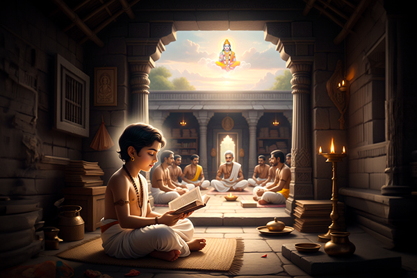 Ramanuja's early life was marked by divine grace and extraordinary intellect. As a young boy, he was known for his brilliance and his deep connection with the scriptures. It is said that when he was a child, he was inspired by the teachings of his mother and began to seek knowledge about the nature of God and the universe. At the age of 16, he began his studies under the guidance of his guru, Yadava Prakasa, a renowned scholar of Advaita philosophy. However, Ramanuja soon realized that the non-dualistic teachings of Advaita did not fully satisfy his spiritual yearning. He then encountered the teachings of the great sage Alvars and realized that devotion to a personal God, specifically Bhagwan Vishnu, was the path to liberation.