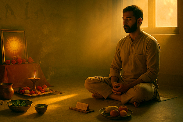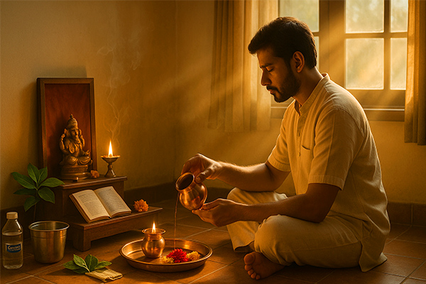 - The bath is performed using leaves from seven sacred plants, such as neem, bilva, or mango, placed on the head and body while reciting mantras dedicated to Bhagwan Surya. This ritual signifies purification of the mind, body, and soul, preparing the devotee for a day of worship and devotion.