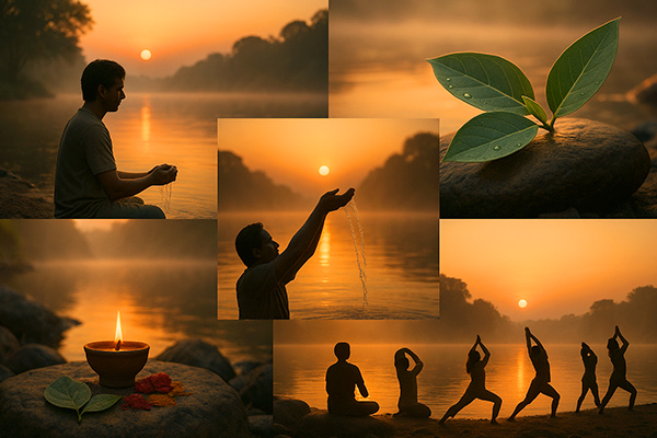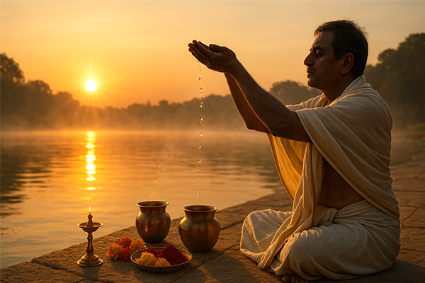 - In the evening, as the sun sets, devotees offer an Arghya (water offering) to Bhagwan Surya while facing the west, symbolizing the end of the day's vrat. The fast is typically broken with light, sattvic food.