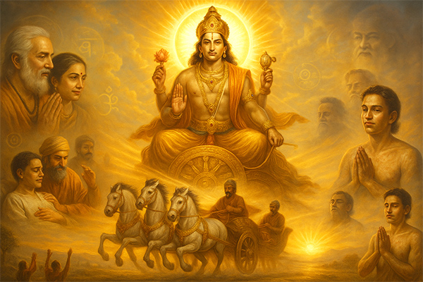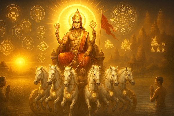 As the soul of beings, Sun, or Surya Dev, gives life and nurtures. His illumination dispels darkness, symbolizing wisdom dispelling ignorance. Civilizations and nations have worshipped the Sun since ancient times. God Sun was Ra to Egyptians and Helios to Greeks. Zoroastrians believe the Sun is the 'Eye of Ahura Mazda,' the supreme Lord, like Hindus believe it's an eye of Vishnu. Ravi is a popular Surya Dev name. Sunday honors Ravivaar. Daily Sun God worship, especially on Sunday, is considered meritorious.