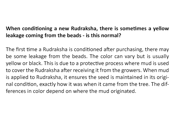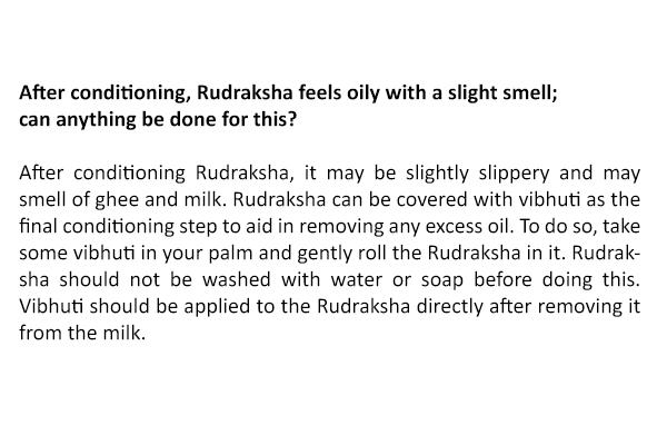 To “condition” the Rudraksha Mala or beads one must first immerse it for 24 hours in Ghee, then immerse it for another 24 hours in Full Fat Milk & then roll the Rudraksha Mala in Vibhuti or Sacred Ash. They recommend that this procedure must be repeated every 6 months & Rudraksha should be conditioned in Sesame Oil every 1-2 years, they promote this as a necessary requirement to consecrate & preserve Rudrakshas.