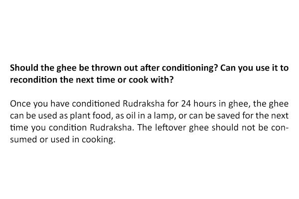 The shelf life of Ghee is 6 months, using the same Ghee for conditioning is very unhygienic and can spoil Rudrakshas