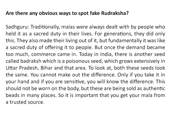Although this point doesn’t matter much but it is very easy to spot the difference between Badraksha and Rudraksha. Bhadraksha does not have natural holes whereas Rudraksha has natural holes. Bhadraksha is not poisonous, but it doesn’t have any healing benefits. Bhadraksha are not available in small mala beads for japa. Usually, the Rudraksha small size Japa Malas you find in India are genuine Rudraksha however there are a lot of different qualities.