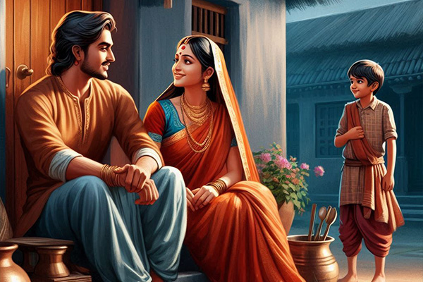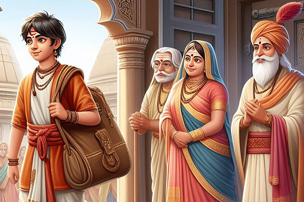 When the merchant’s son finished his education, he and his maternal uncle started their journey back home and continued making donations and holding spiritual discourse gatherings. They reached the kingdom where the merchant’s boy had got married to the Princess of that kingdom. The King recognized the merchant’s boy and respectfully brought him to the palace, honouring him as his son-in-law. Later, the King organised his daughter to leave for her in-laws’ place on an auspicious day and gifted the merchant’s son with rich dowry.