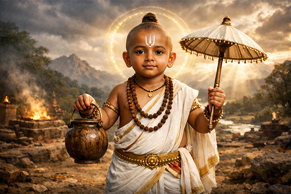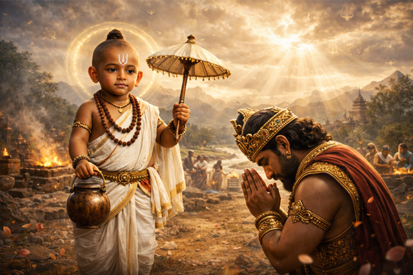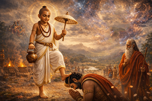 Observing Mahabali's growing dominion, Indra, the King of Devas, and other celestial beings approached Bhagwan Vishnu, pleading for divine intervention. The Supreme Bhagwan, ever compassionate towards all beings, decided to restore cosmic balance, not through war but through wisdom. In response, Bhagavan Vishnu incarnated as Vamana, a radiant young Brahmachari (celibate Brahmin boy), born to Sage Kashyapa and Mother Aditi, appearing at the sacred site of Badrikashrama. Clad in simple robes, holding a kamandalu (water pot) and a staff, his divine brilliance concealed his omnipotence. With his serene and humble demeanor, he walked towards the grand Ashwamedha Yajna (horse sacrifice ritual) being conducted by Mahabali, where the king was bestowing gifts upon all seekers.
