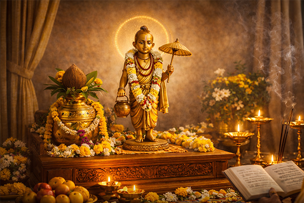 The day begins with cleaning the puja area and setting up an idol or image of Vamana Bhagavan. A kalash (sacred water pot) is placed beside the idol, symbolizing divine energy. Devotees wear clean or yellow-colored clothes, as yellow is considered sacred to Bhagwan Vishnu.