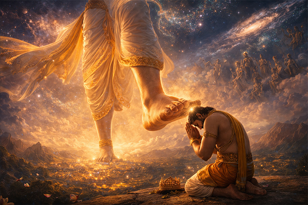 As soon as Mahabali granted the boon, Vamana began to grow in size, expanding into the gigantic form of Trivikrama. With his first step, he covered the entire earth. With his second step, he measured the heavens. There was no place left for the third step. Realizing his mistake yet accepting his fate with devotion, Mahabali humbly bowed before Bhagwan Vishnu and offered his own head as a place for the final step. Vamana then placed his foot on Mahabali’s head and sent him down to Sutala, the lower realm.