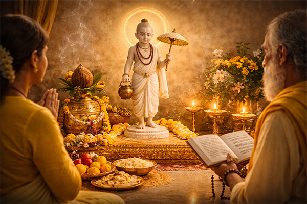 - The puja begins with Sankalp (a vow of observance), where devotees express their intent to worship Bhagwan Vamana with devotion.
