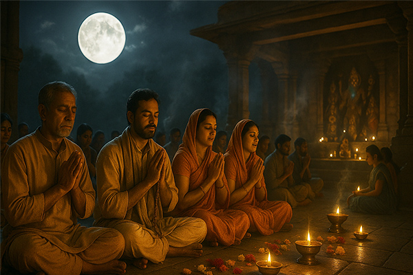 - Chanting: The main puja includes chanting mantras and offering prayers to deities such as Bhagwan Vishnu, Bhagwan Shiva, or Lakshmi Devi, depending on regional traditions. Devotees recite stotras and hymns to invoke blessings for prosperity, harmony, and spiritual growth. Meditating or sitting in silent contemplation under the full moon is considered particularly auspicious, as the moon's energy is believed to enhance spiritual focus and inner peace.