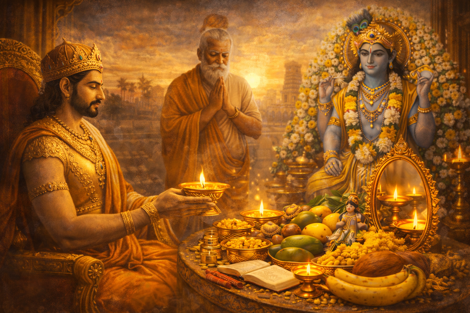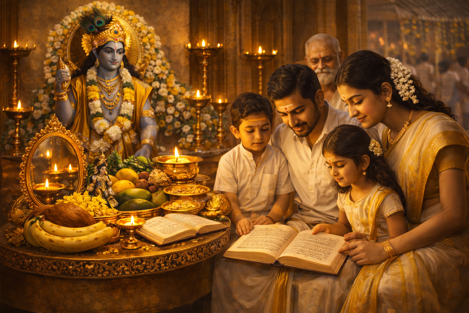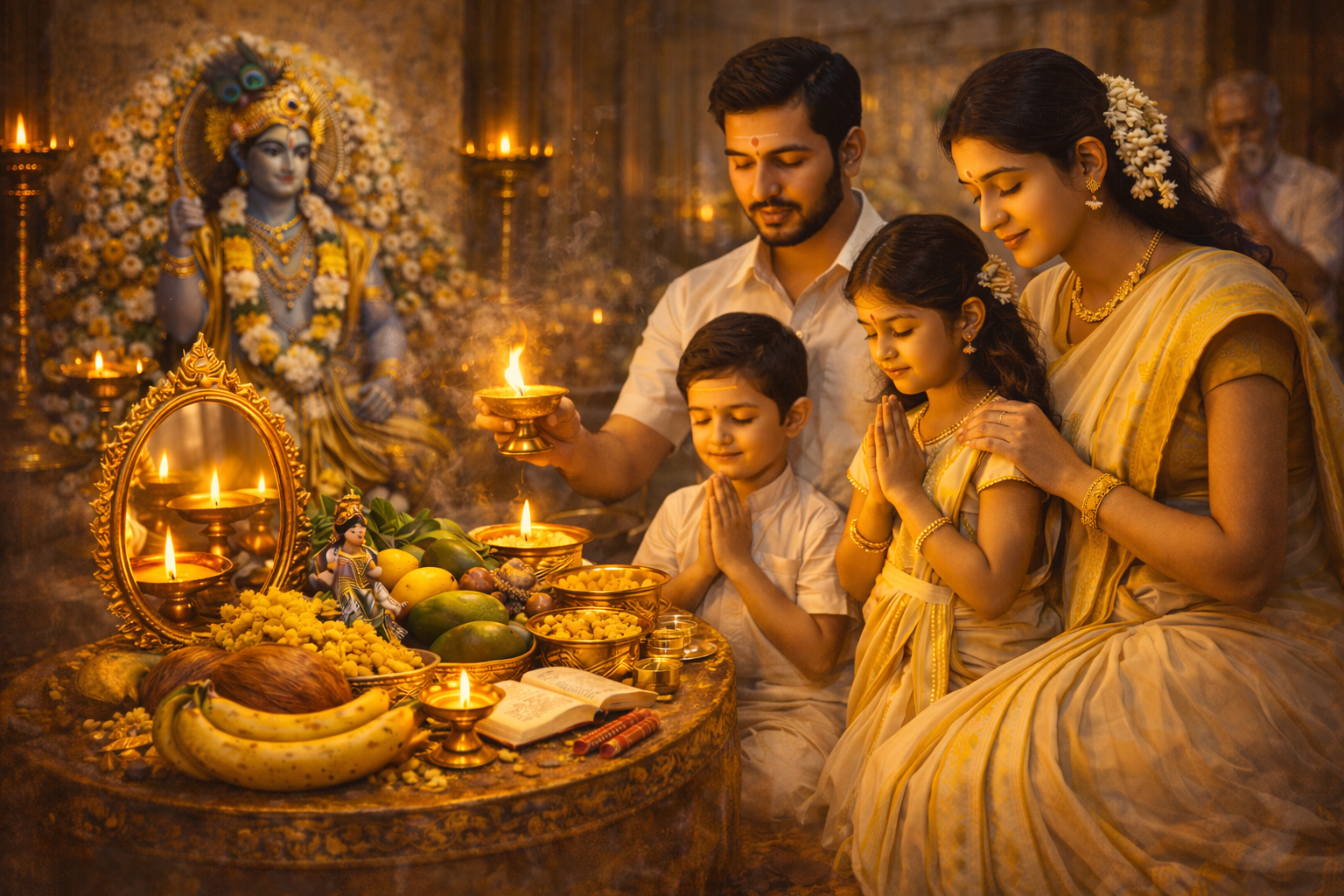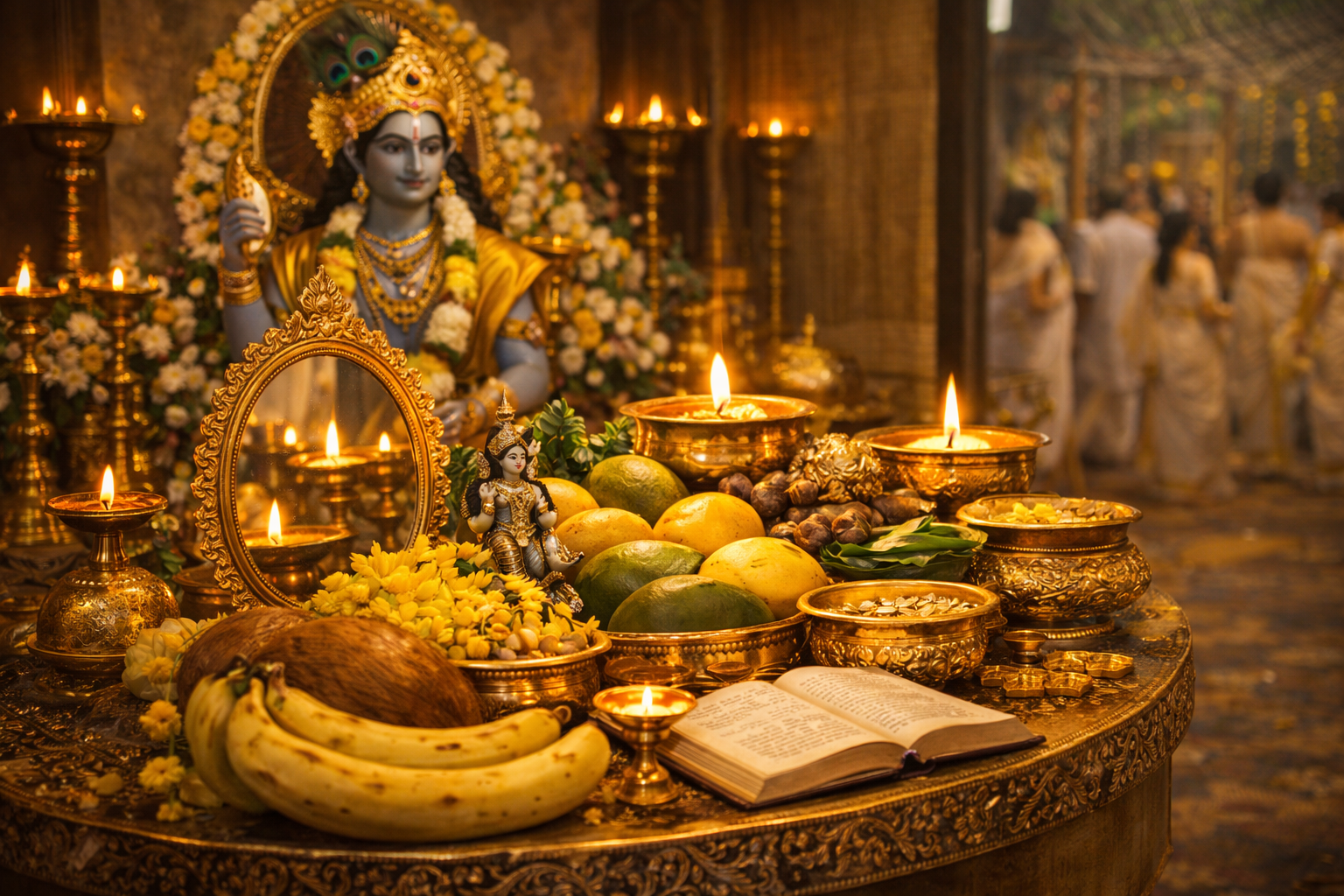 The worship begins with the setting up of the Vishu Kani, a sacred arrangement of auspicious items. These include Kani Konna flowers (yellow flowers), coconuts, betel leaves, rice grains, fresh lemons, coins, and a metal mirror. A Nilavilakku (traditional Kerala lamp) is lit next to the Kani and placed in front of the Bhagwan Vishnu or Bhagwan Krishna idol.