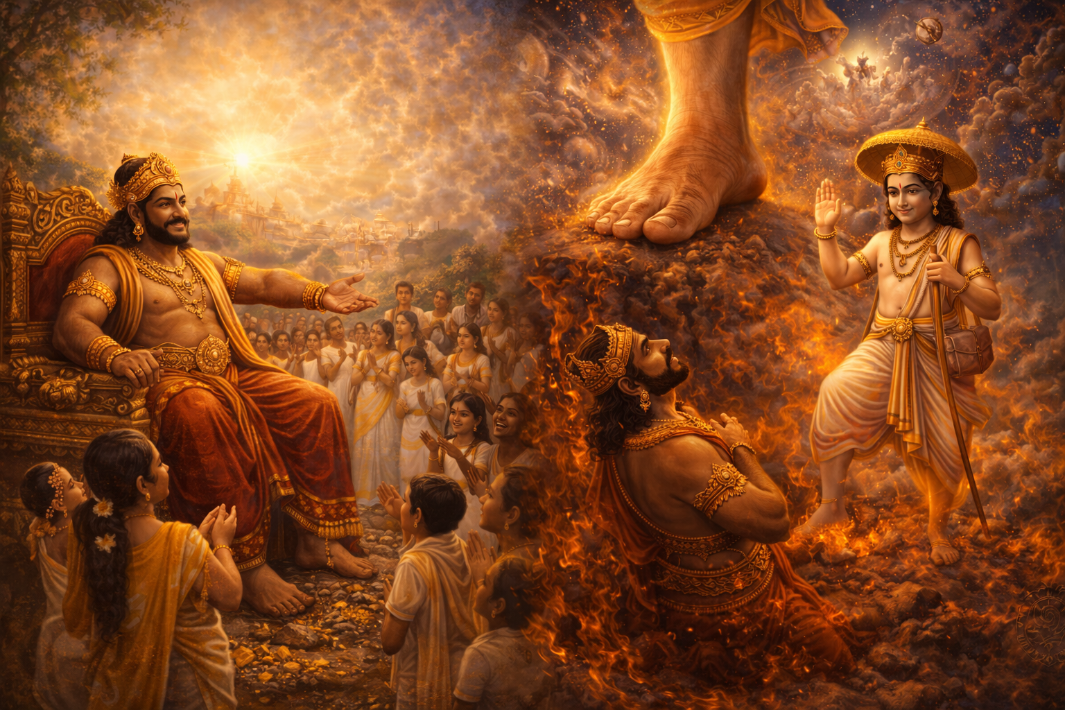 Bhagwan Vishnu, in his Vamana (dwarf) incarnation, approached King Mahabali disguised as a Brahmin and asked for three paces of land. King Mahabali, known for his fairness, agreed to the request. In a miraculous display of divine power, Bhagwan Vishnu took his three strides, covering the entire universe in one step and banishing King Mahabali to the netherworld. Despite this, King Mahabali's devotion to his people was so strong that he was granted permission by Bhagwan Vishnu to visit his kingdom once a year.